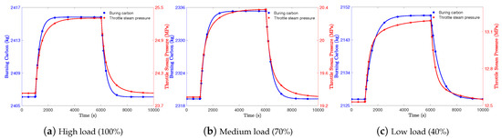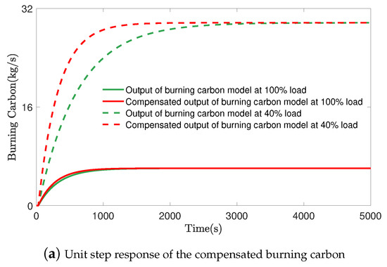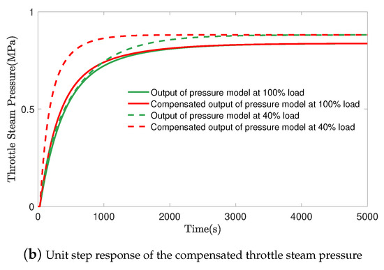 The pole is shifted left from to when . Also, both (13) and (14) have the same static gain K. Thus, the compensated burning carbon could be accelerated. Figure 7 shows the unit step response of the compensated burning carbon and throttle steam pressure model at different loads, in which . It can be found that dynamics at low load is more compensated.