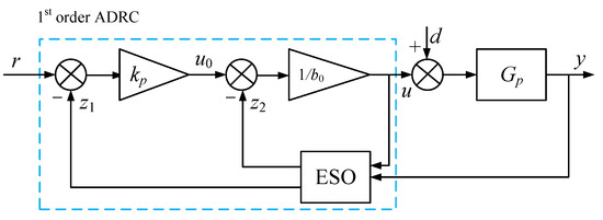 Thus, for the 1st order ADRC we have four parameters to be determined, namely , , , and . Once the ADRC is well tuned, the system output can track the reference while overcoming the uncertainties. The structure of the 1st order ADRC is illustrated by Figure 4, where denotes the transfer function of the controlled plant.