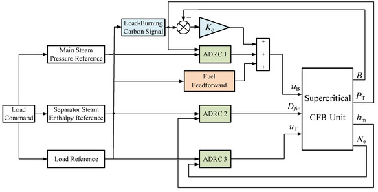 Structure of the burning carbon based decentralized active disturbance rejection control (ADRC) for a supercritical CFB unit.