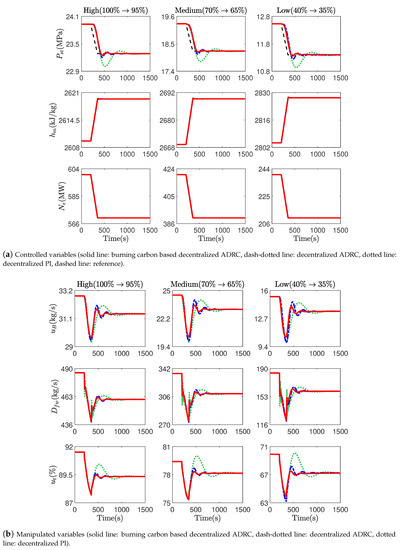 The settling time of throttle steam pressure can be further improved under the proposed burning carbon based decentralized ADRC. As analyzed in Section 3.2, the burning carbon based compensated method ameliorates the dynamics of fuel-main steam pressure loop. The devised ADRC controller can result in a faster tracking performance. According to Table 2 and Table 3, the settling time is about 50% less than that of decentralized PI method [16], and about 19% less than that of decentralized ADRC method [37]. In addition, it can be observed that the improvements of settling time at low load region is larger than that at high/medium load region. This is due to the fact that dynamics at low load are more compensated, as shown in Figure 7.