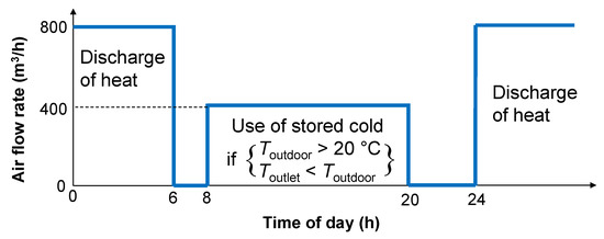 An air-PCM heat exchanger, described in detail in the next section, was considered in the study. The simulated scenario was as follows. The rejection (discharge) of heat from the air-PCM HEX took place at night between midnight and 6:00. The air flow rate through the heat exchanger was 800 m/h during the discharge phase. The air passing through the air-PCM HEX during the discharge (rejection) of heat was assumed to return to the outdoor environment. The cold stored in the air-PCM HEX was utilized during the day. Several conditions were set for the utilization of the stored cold. The outdoor air would be supplied to a building through the air-PCM HEX between 8:00 and 20:00, but only if the outdoor air temperature was above 20 C and the outlet air temperature of the air-PCM HEX was lower than the outdoor air temperature. When the air was supplied to a building through the air-PCM HEX, the air flow rate was 400 m/h (Figure 1). The simulation model of the air-PCM HEX allows for the calculation of the heat loss/gain to/from the surrounding environment, but the adiabatic walls of the exchanger were considered in the study. Considering a relatively small temperature difference between the inside of the air-PCM HEX and the ambient environment in the passive cooling operation, almost adiabatic walls can be achieved in practice with an appropriate level of (inexpensive) thermal insulation.