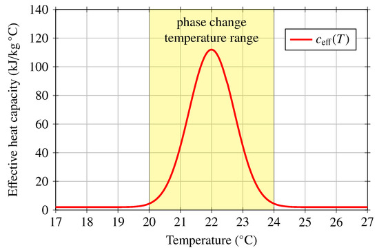 where is the heat capacity outside the temperature range of the phase change, is the increment of the heat capacity corresponding to the latent heat of the phase change, is the mean phase change temperature, and is a parameter characterizing the range of the phase change. The curve of the effective heat capacity according to Equation (2) for the PCM with these parameters, with and other properties shown in Table 1, can be seen in Figure 3.