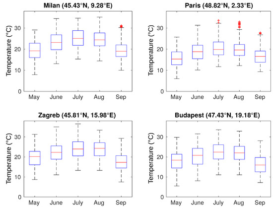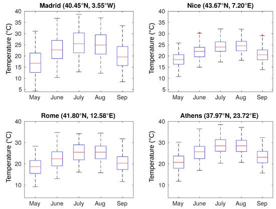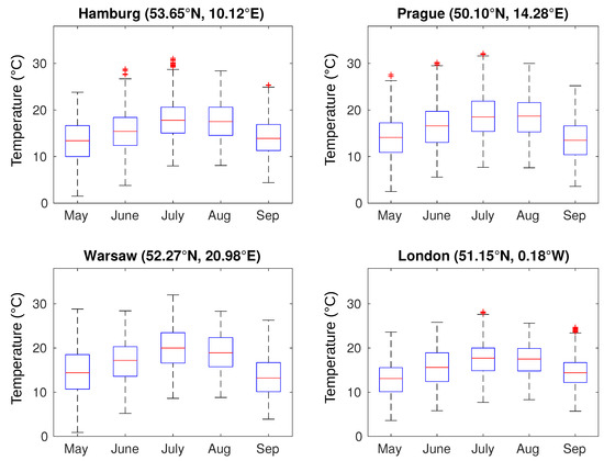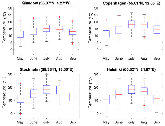 Figure 4 shows the boxplots of outdoor air temperature of four cities located above the 55th parallel. A box plot is a graphical representation of numerical data by means of their quartiles. The red horizontal line indicates the median, and the blue box represents values in the second and third quartile (between the 25th and 75th percentiles). The whiskers reach the most extreme values (maximum and minimum values), which are not considered outliers, while the outliers are plotted individually as red plus signs. The outliers had values that were 1.5-times the interquartile range below the 25th percentile or above 75th percentile.