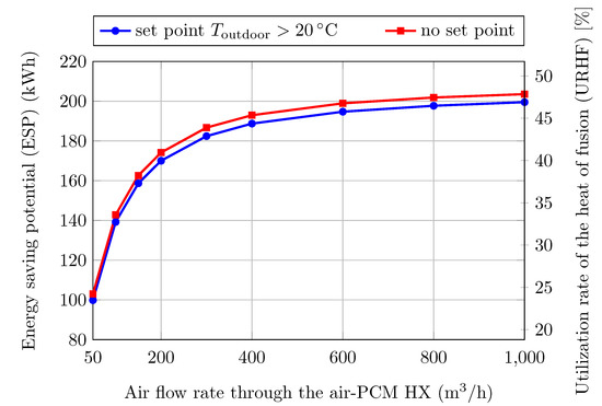 Figure 8 shows the comparison of the ESP and the URHF, in the case of Madrid, for the daytime air from rates from 50 m/h–1000 m/h (the air flow rates at night were twice higher, from 1000 m/h–2000 m/h) for the scenarios with and without the temperature set point. The results in Figure 8 are shown for the nominal phase change temperature . The chart shows a rather significant influence of the air flow rate below about 400 m/h (0.125 kg of PCM per 1 m/h of the air flow rate). This PCM mass to air flow rate ratio is significantly lower than the 1–1.5 reported in [9]. However, it needs to be emphasized that a very different type of air-PCM HEX (cylindrical packed bed) was used in that study. Furthermore, the PCM considered in the study had a smaller melting enthalpy and a wider temperature phase change range than the PCM considered in the present study. This only demonstrates the difficulty of providing quantitative recommendations that would be generally applicable in a latent heat thermal energy storage. Fortunately, with the current state of knowledge and many available models and simulation tools, it is possible to investigate the performance of a particular design of LHTES under a given set of operating conditions.
