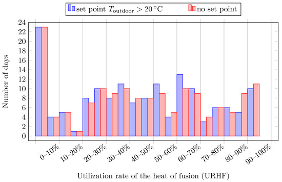 The comparison of the URHF for Madrid in the case of the scenarios with and without the temperature set point, in the form of histograms, is shown in Figure 9. Each bar of the histogram represents a URHF range of 5%. The histograms are for the daytime air flow rate of 400 m/h and the nominal phase change temperature of the PCM . As can be seen, the URHF did not exceed 95% in either of the scenarios, but on about 10 days, the URHF was over 90%. As already mentioned earlier, the outdoor temperature set point had only a small impact on both the ESP and the URHF in the case of Madrid.