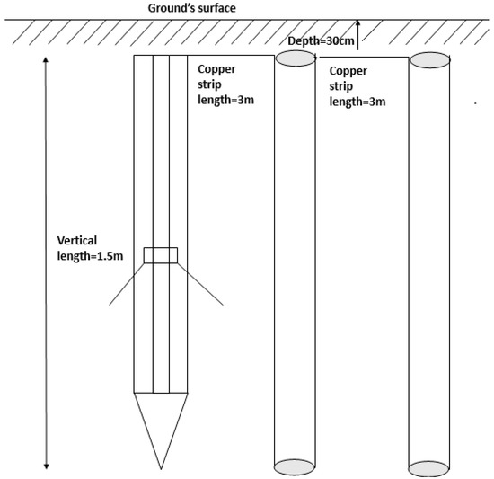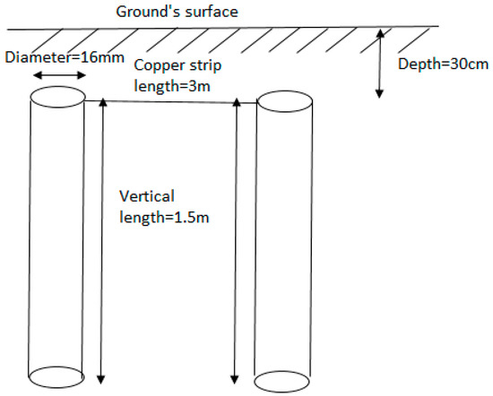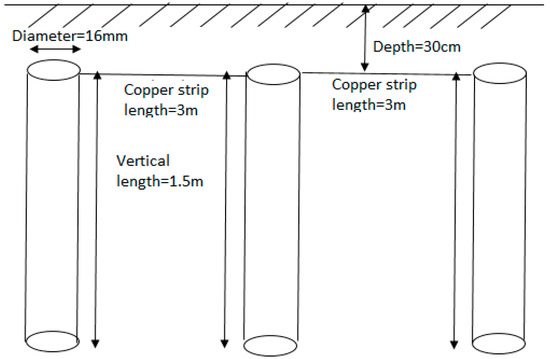 The test area contains six configurations; a vertical single rod electrode (see Figure 1), two parallel vertical rod electrodes (see Figure 2), three parallel vertical rod electrodes (see Figure 3), a GDSR (see Figure 4), a GDSR in parallel with vertical one rod electrode (see Figure 5), a GDSR in parallel with two vertical rod electrodes (see Figure 6). Each installed vertical rod electrode is 1.5 m long and has a 16 mm diameter. The interconnections between the vertical electrodes were done with copper strips, with a width of 2.5 cm, and length of 3 m, buried to a depth of 30 cm under the ground surface. For lower current impulse tests, two new configurations were laid, where a single rod electrode was installed at 50 cm depth, and a GDSR buried to a depth of 50 cm. Very little has been mentioned in literature on the recommended spacing between the vertical rods. In [22], it is stated that ‘spacing of less than 3 m may not provide the most economical use of materials’. This shows that it is not effective to have the adjacent vertical rods too close to each other. On the other hand, [23] stated that the recommended spacing between rods should be at least 2 times the length of the rod. No specific study has focused on the effect of spacing changes on the mutual effects and performance of grounding systems. In the current study, the vertical rods were all arranged with a spacing between the rods of no less than twice the length of the electrode.