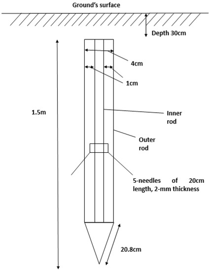 - Yunus, M.; Nor, N.M.; Agbor, N.; Abdullah, S.; Ramar, K. Performance of Earthing systems for Different Earth Electrode Configurations. IEEE Trans. Ind. Appl. 2015, 51, 5335–5342. [Google Scholar] [CrossRef]
