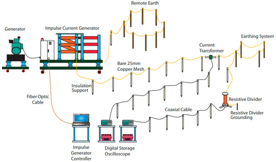 Much work [1,2,3,4,5,6,7,8,9,10,11,12,13,14,15,16,17,18] has been carried out to characterize practical earthing systems under fast-impulse, high-magnitude current conditions. As generally known, experimental investigations on practical earthing systems under high impulse currents can provide more realistic results on the characteristics of earthing systems under high currents, in comparison to laboratory and computational methods. The first work on impulse characteristics by field measurement was carried out by Towne [1] in 1928, on galvanized-iron pipes with peak currents up to 900 A. In 1941, Bellaschi [2] had used deep-driven earth rods with current magnitudes between 2 kA to 8 kA. The following year, Bellaschi [3], completed further tests on 12 earth rods, with impulse currents of 400 A to 15.5 kA. There have been a lot more impulse tests [4,5,6,7,8,9,10,11,12,13,14,15,16,17,18], were carried out on practical earthing systems, where tit was found that the ‘impulse resistance’ values were found to be less than those measured for low voltage, low frequency currents [1,2,3,4,5,6,7,8,9,10,11,12,13,14,15,16,17,18]. A lot of improvements and suggestions in the impulse test methodology on practical earthing systems can also be seen in the last three decades [1,2,3,4,5,6,7,8,9,10,11,12,13,14,15,16,17,18]. Impulse tests have also been carried out on practical earthing systems considering various factors, namely; earth electrode geometry, soil resistivity, impulse polarity and voltage/current magnitudes [1,2,3,4,5,6,7,8,9,10,11,12,13,14,15,16,17,18]. For the study of grounding performance with the current magnitudes up to 5 kA, limited studies have been carried out on the effect of the earth electrode’s configuration. A remarkable work was done in [4,5,6], where impulse tests were conducted on various practical earthing systems, with current magnitudes of more than 20 kA. It was found that the impulse resistance becomes less current dependent in high currents. For the effect of soil resistivity, it was reported in [19,20] that in a low resistivity test medium, it is possible that no ionization process occurs in the test since the gaps between the sand grains are filled with water, and little field enhancement is expected to occur since there is only a small dielectric difference between the soil and the air gaps. In addition, this could also be due to the fact the earthing systems may have become a conducting mass in low resistivity soil.