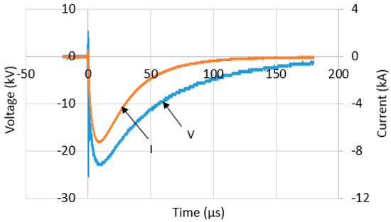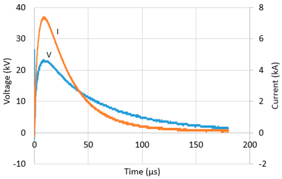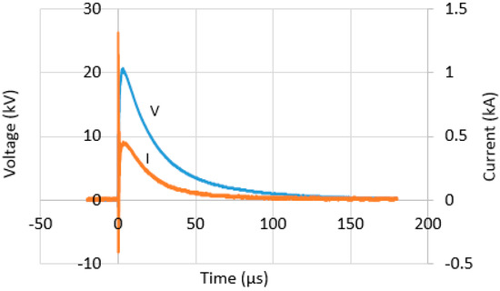 Voltage and current traces for configuration 8 at charging voltage of 25 kV under positive polarity.