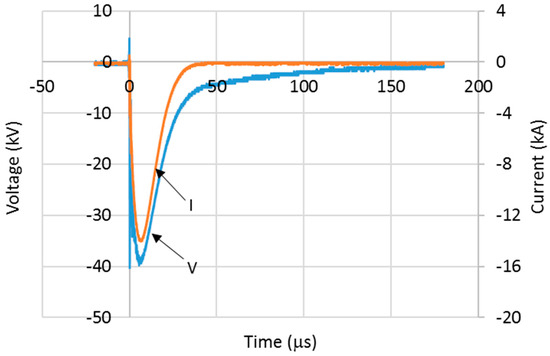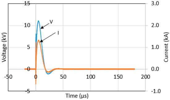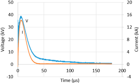 Figure 10 and Figure 11 show selected typical voltage and current traces for configuration 2 at charging voltages of 150 kV and 350 kV, respectively. The voltage and current traces of other configurations and voltage magnitudes were similar to those presented in Figure 10 and Figure 11. In this work, the time to discharge to zero for current trace was measured. This parameter may provide information related to the effectiveness of the grounding systems in discharging a high current into the ground, where the faster the time taken to discharge for current trace, the better the grounding system is.