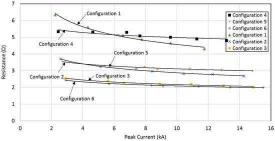 Impulse resistances versus current peak for configuration 6.