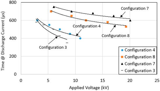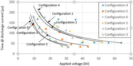 Figure 12 shows the measured time to discharge to zero for current trace at different applied voltage. For all configurations, (except for configuration 4), the time for current trace to discharge to zero were found to be independent of applied voltage. Configurations 3 and 6, with large sized grounding systems were found to have a faster time for the current trace to discharge to zero, which shows the good conductivity of the grounding systems. Generally, it is understood that the larger the size of a grounding system, the less time taken for current to discharge to zero, due to the fact more paths are available for the current to disperse. Some discrepancies in the results were also seen, where the time taken for current trace to discharge to zero for configuration 5 is higher than that configuration 1 and 2, despite the fact configuration 5 has a larger sized grounding system. This could be due to uncontrollable thermal and ionization processes in the soil, which have been highlighted in previously published work [1,2,3,19,20]. Another possibility is that this is also due to the inductive component, which can be significant under transient conditions. However, it is out of the scope of the current paper to come up with the equivalent circuit, and show evidence of an inductive effect for each configuration.