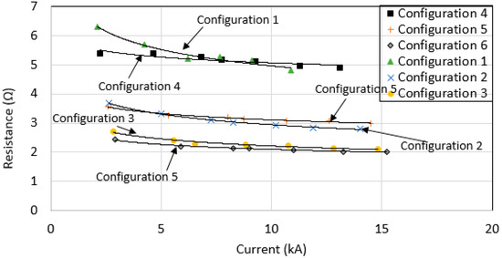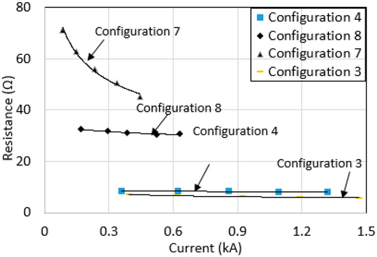 In this study, the impulse resistance, Rimpulse, was determined as the ratio of voltage at the peak current to the corresponding peak current. Figure 13 shows the measured Rimpulse for various grounding systems under high impulse currents, up to 16 kA. As can be seen, there is little dependence of Rimpulse on the current magnitudes (except for configuration 1). Configuration 1 had the highest RDC, and thus expectedly showed the highest reduction, as claimed in many prior publications [2,3,4,5,6,7,8,9,10,18,19,20,21] where the higher the DC earth resistance, the higher the current-dependent characteristics of earth resistance during the passage of high currents.