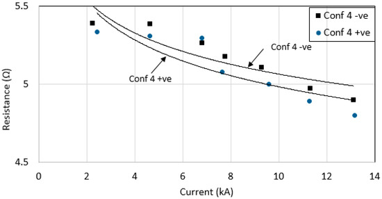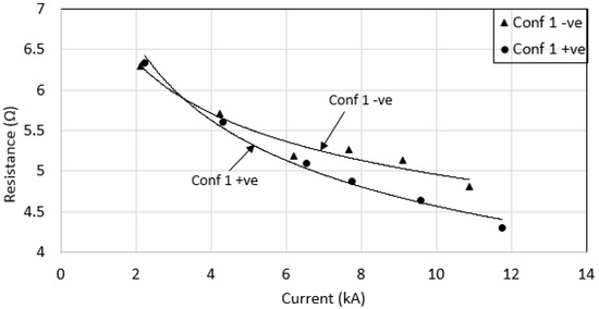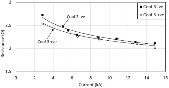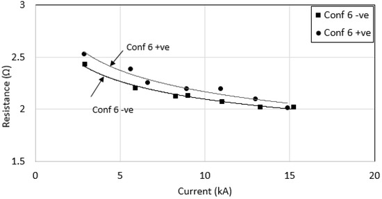 When the voltage magnitudes under negative impulse polarity were increased, the Rimpulse was found to have small reduction with increasing current (see Figure 21). Configurations 3 and 6, with larger sized grounding systems were found to have the lowest Rimpulse, which is a similar trend to that obtained under positive impulse polarity. These measured Rimpulse values with increasing currents were also plotted together under both impulse polarities for each configuration (see Figure 22, Figure 23, Figure 24, Figure 25, Figure 26 and Figure 27). As can be seen, for configurations 1, 2, 3 and 4, a higher Rimpulse was recorded with negative impulses compared with positive impulses, as shown in Figure 22, Figure 23, Figure 24 and Figure 25, respectively. A similar trend was seen in [20,21] whom conducted laboratory tests where Rimpulse values were found to be higher for negative impulses than for positive impulses. As generally known, a decrease in Rimpulse with increasing voltage indicates the ionization process in soil, which was thought to occur in the air voids within the soil [1,2,3,19,20]. Since it is expected that the discharges in air would require higher level voltages, and less currents for negative impulses compared to positive impulses, higher Rimpulse in negative impulses than positive impulses would occur. When Reffin et al. [18] performed experiments using field measurements on practical grounding systems installed in various soil conditions, they found that higher Rimpulse with negative impulses than that positive impulses for grounding systems with high RDC (62.6 Ω). On the other hand, Rimpulse was found to be independent of impulse polarity for low RDC (4.7 Ω). In this work, the electrodes were installed at the same site, with the same soil resistivity profile. The highest RDC values are for configurations 1, 2, 3 and 4, and these configurations were found to have higher Rimpulse under negative impulses than under positive impulses. On the other hand, for lower RDC (configurations 5 and 6), the results were found to be inconsistent, where Rimpulse were found to be independent of impulse polarities for configuration 5, and Rimpulse were found higher under positive impulses than that negative impulses, as shown in Figure 26 and Figure 27 for configurations 5 and 6, respectively.