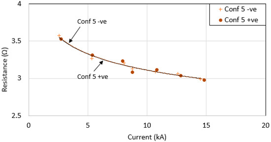 Impulse resistances versus current peak for configuration 5.