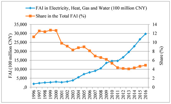 Figure 2 presents the results for electricity and other utilities due to data availability). Specifically, the investments in fixed assets went up from 186 billion CNY in 1996 to 2973 billion CNY in 2016. However, the share of investments in fixed assets in the electricity and other utilities sector (compared to investments in all sectors) went down from 11% in 1996 to 4.9% in 2016. However, a slight rebound has been observed since 2012. Therefore, investments in the electricity sector grew dramatically during 2011–2016, yet the relative importance of such investments has decreased in general. These patterns indicate that an increase in investments in grid developments is possible if a higher share of the total investments is diverted there. As mentioned before, the establishment of smart grids requires the aggregation of different sources of energy (i.e., different types of utilities).