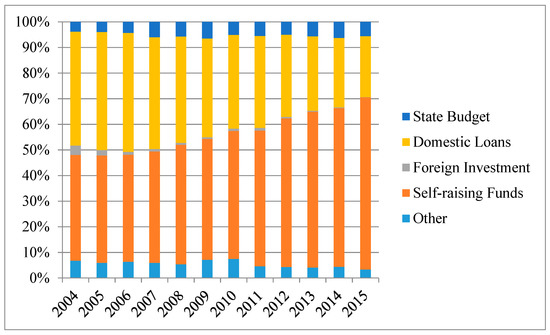 Figure 3). A key trend is that the role of the self-raising funds has become more important. Specifically, the share of the investments facilitated by self-raised funds grew from 41.4% in 2004 to 67.3% in 2015. The share of domestic loans decreased from 44.5% to 23.7% during the same time period. Therefore, the latter source lost its position as the primary source of fixed asset investments in production and supply of electricity, heat, gas, and water. The share of investments financed by the state budget increased from 3.8% to 5.6%. The share of foreign investments went down from 3.6% to 0.01%. Therefore, self-raised funds remain the most important source of investment in energy infrastructure. This suggests that the development of smart grids in China will be closely related to the performance of domestic companies. Support based on public funds remains less important, but has been associated with an increasing relative contribution. Note that these findings are related to investments in both electricity and other utilities.