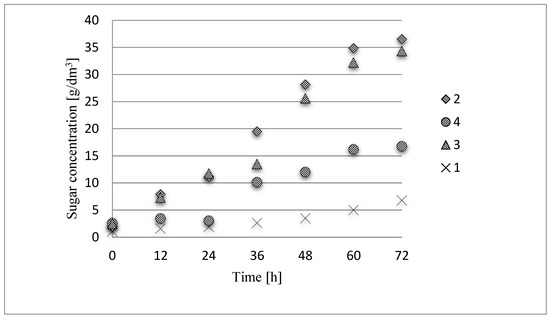 The concentration of sugars obtained after the enzymatic hydrolysis process of triticale straw: 1—control sample, without pretreatment; 2—after pretreatment with ionic liquid; 3—after chemical pretreatment (sulfate method); 4—after pretreatment using recycled ionic liquid.