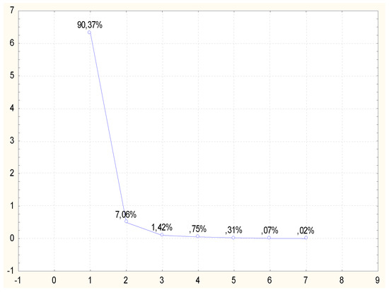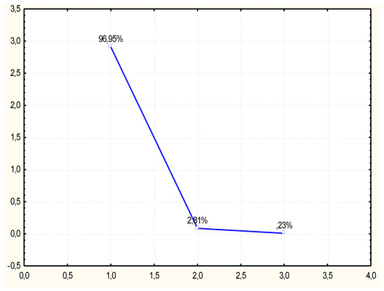 The main limitation of the use of ionic liquid at an industrial scale is its high price. The increasing interest of the industry in these solvents, their wide and easy use and lack of toxicity for the environment constitutes the basis for the statement that the price of ionic liquid may be reduced in the future [28]. Another method for the reduction of the cost of industrial use of ionic liquids is the development of an efficient method for their recycling and reuse in another process. Based on the above statements, a study was implemented concerning purification of the ionic liquid-1-ethyl-3-methylimidazolium acetate after the purification process of rye straw and its reuse for the pretreatment of a new portion of the lignocellulose material. The efficiency of rye straw pretreatment using recycled ionic liquid was evaluated comparing the yield of reducing sugars after enzymatic hydrolysis of the material. The majority of the cellulose fraction of the biomass is retrieved from the ionic liquid via addition of a so called non-solvent. Water can be such a non-solvent for imidazolium ionic liquids, which, by precipitating cellulose from the solution, creates one phase with the ionic liquid. The cellulose from such a mixture was removed by filtration or centrifugationn. The water remaining in the solution was removed via lyophilization. As a result of lyophilization, a yellow-brown ionic liquid was obtained, with a color similar to that of a pure ionic liquid. The mean content of reducing sugars obtained after enzymatic hydrolysis of rye straw purified with recycled ionic liquid was 16.77 g/dm3, that is approx. 52% lower than the mean content of reducing sugars obtained through hydrolysis of rye straw purified with the pure ionic liquid. Xu et al. [29] subjected eucalyptus samples to purification and enzymatic hydrolysis. The purification was conducted using pure and recycled ionic liquids (AMIMOAc and EMIMOAc). The ionic liquid recycling was conducted by vacuum drying. These authors demonstrated that both pretreatment with pure ionic liquid and recycled ionic liquid influences the change of the structure of cellulose in eucalyptus and improves the yield of reducing sugars after enzymatic hydrolysis. In order to attempt a classification of the types of treatments of lignocellulose materials in terms of obtaining the highest concentration of reducing sugars after enzymatic hydrolysis process, the obtained results were analyzed using the Principal Components Analysis (PCA) method. The active variables consisted in the reducing sugars concentration values determined at specific time intervals. The grouping variables were three types of pretreatment used prior to the hydrolysis process: treatment using ionic liquid, using recycled ionic liquid, sulfate method treatment and sample with the native material, i.e., not subjected to any pretreatment. Results of reducing sugars determined in three repetitions, for each time interval, were used for the PCA analysis conducted in the present study. The PCA analysis was conducted based on a correlation matrix. From the set of the analyzed data four factors were obtained with values >1, which characterized samples after pretreatment in the sense of their similarities and differences. They explained a total of 97.43% of the total variability, and 90.37 % of the variability could be explained by the single main component Z1. The second distinguished component Z2 explained 7.06%, and the Z3 component slightly over 1 %. Data dimension reduction was conducted based on a screening plot (Figure 2). The moment of graph flattening is visible after the second component, thus the subsequent analyses were conducted on this basis, referring solely to the influence of components Z1 and Z2.