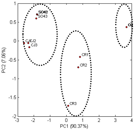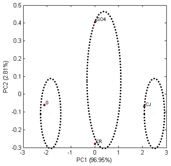 The most extreme location on the observation chart is taken by the samples marked as ‘0′ and ‘CJ’. This indicates the greatest differences between ethanol concentrations in these samples, which is linked to the use of pretreatment with ionic liquid. The highest increase of ethanol was observed for triticale straw subjected to ionic liquid treatment, the Euclidean distances of the remaining samples in relation to the control sample of triticale straw (0) are similar.