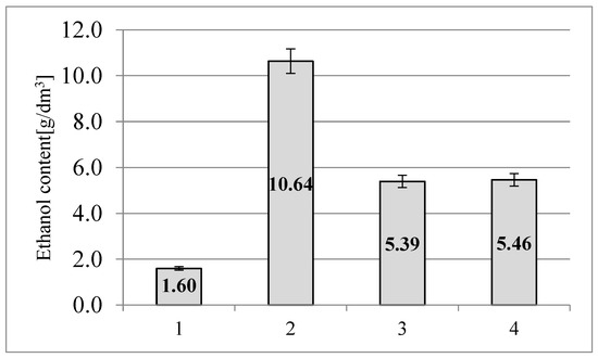 The highest concentration of ethyl alcohol (10.64 g/dm3) was demonstrated in the sample of triticale straw purified with ionic liquid (Figure 4). For comparison, the content of ethyl alcohol in the control sample was 1.60 g/dm3. These differences result from the fact, that the hydrolysate of triticale straw purified with ionic liquid was characterized by a higher concentration of reducing sugars, as well as lower lignin content, which blocks the functioning of yeasts in mash.
