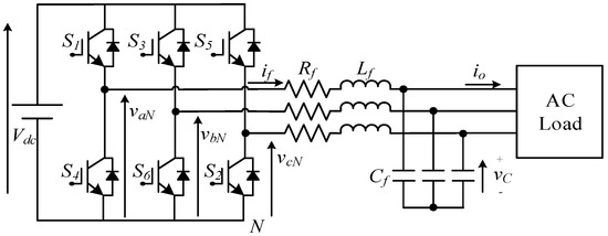 A three-phase two-level voltage sources converter (VSC), which consists of three legs and an inductance and capacitor (LC) filter, is shown in Figure 1. There are two switches in a leg with two possible switching states. The combination of three legs creates eight different possible switching states, as given by Equation (1):