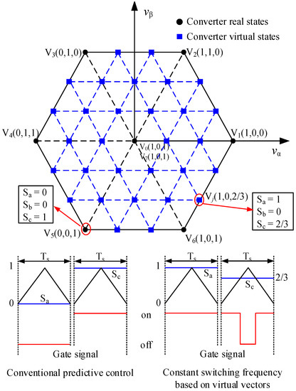 Conventional predictive voltage control considers the eight voltage vectors to predict the system response and evaluate the cost function. However, this method leads to variable switching frequency, and needs a high sampling time () to maintain high performance. In order to overcome the problem of variable switching frequency, the predictive control with constant switching frequency using virtual vectors was proposed in [11]. The idea behind this control technique is to use additional virtual voltage vectors to evaluate the cost function. The optimal voltage vector including the virtual voltage vector is used to find the optimal control region. Then, the discrete space vector modulation (SVM) is used to generate the pulse signals for the power semiconductor. The virtual vectors can be obtained as a linear combination of real vectors () as follows: