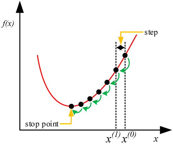 In gradient descent, the search direction is the negative slope at that point, i.e., . Thus, iterative searches of gradient descents can be explained through the following recursive rules [27]: