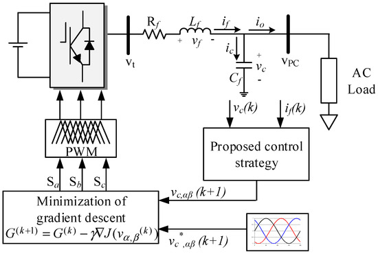 The gradient descent-based predictive control strategy (GD-MPC) iteratively updates function G in Equation (12) using the available voltage vector () until it reaches the stationary point corresponding (Figure 3) to the minimum value of the cost function:
