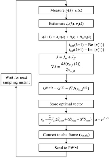 The overall control diagram of the proposed GD-MPC is shown in Figure 4, and Figure 5 shows the control algorithm of the GD-MPC method. The optimal voltage vector for the next sampling instant is found by the gradient descent. Pulse width modulation (PWM) is used to generate the pulse signals for the power converter based on the optimal voltage vector.