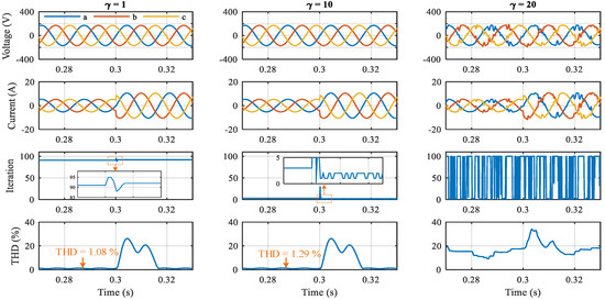Three cases are carried out to show the effect of the learning rate γ on the control performance of the converter system, which are γ = 1, γ = 10, and γ = 20. The real-time simulation results are shown in Figure 6. It is assumed that the load is increased at 0.3 s, and the root mean square (RMS) load voltage is 220 V. It can be seen that the proposed MPC with gradient descent is stably operated when the load is changed. In three cases, the inverter current is increased quickly to compensate for the load change.