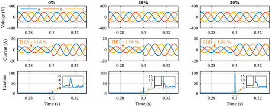 There are three cases are considered in this section, which are the original filter inductor L, a 10% change of L, and a 20% change of L. The real-time simulation results of three cases are shown in Figure 7. At 3 s, the load is increased, which results in an increase of inverter output current. It can be seen that the proposed MPC method is robust regarding the change of filter inductor. The output voltage and current of the converter are high qualities. There is an impact of the uncertain parameter on the control performance of the proposed method. It takes more iterations to find the optimal voltage vector when the filter inductor is changed. It can be seen that in the case of the original value of L, the maximum iteration to find the optimal voltage vector is 12 at the load changing. However, in the case of a 10% change in the L value, the maximal iteration is 30, whereas it is 100 in the case of a 20% change. However, the overall performance of the proposed method is stable in this scenario.