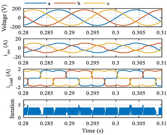 Figure 8 shows the control performance of the proposed MPC method in the nonlinear load condition. The diode bridge rectifier is used as a nonlinear load in this study. It can be observed that the output voltage is still sinusoidal, although the load current is highly distorted. The nonlinear load has a slight impact on the iteration of the proposed method. However, the maximum iteration is only five in this condition. Generally, the proposed MPC method is operated stably in this condition.
