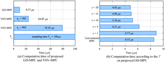 Figure 9 shows the comparison of the computation time of the proposed GD-MPC and other MPC techniques such as VSV-MPC and conventional MPC. It can be seen in Figure 9a that the proposed GD-MPC method could significantly reduce the computation time compared to the VSV-MPC method. The execution time of the GD-MPC is 9.77 μs, whereas it is 24.7 μs or 79.29 μs in the cases with the VSV-MPC method. The execution time of the proposed GD-MPC method is much smaller than that of the VSV-MPC method, because the proposed method takes less than only five iterations to find the optimal voltage vector, whereas the VSV-MPC method always takes 482 or 962 iterations to find the optimal vectors.