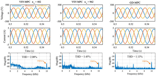 The control performances of the proposed GD-MPC method, the VSV-MPC method, and conventional MPC method are shown in Figure 10. It can be seen that the performance of the conventional MPC method is not good, because only eight vectors are used to control the voltage. Thus, a lot of computation time is not required, but the performance is not good. Also, the performance of the VSV-MPC method is improved by increasing the number of virtual state vectors. With the number of virtual state vectors equal to 962 in the case of the VSV-MPC method, the output voltage and current are sinusoidal with low THD values (average THD = 1.45%). With the proposed GD-MPC method, the THD of the output current is still smaller than that in the case of the VSV-MPC method, which has 962 virtual state vectors, despite its small computation time. It is observed that the proposed GD-MPC method performs better than the VSV-MPC method, and the computation time of the GD-MPC method is much smaller than that of the VSV-MPC method.