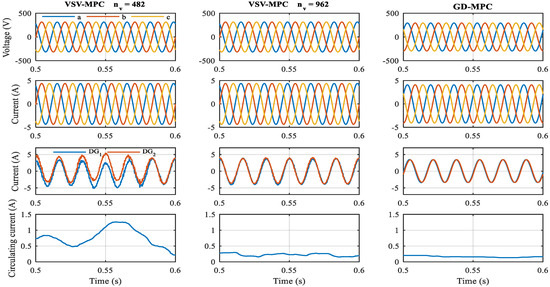 The circulating current exists between two parallel inverters due to the line impedance mismatch. Figure 12 shows the results of the two control methods in the tested MG system. As shown in this figure, both GD-MPC and VSV-MPC could stably control the converter in the tested MG system. The output voltage and current of the inverter are sinusoidal. However, the circulating current between two inverters exists, as can be seen in Figure 12. The circulating current in the case of the VSV-MPC method with 482 virtual state vectors is the largest, whereas that in the case of the proposed GD-MPC method is the smallest. The THD value of the output current in the case of the proposed GD-MPC method is smaller than that the case of the VSV-MPC method, with 962 virtual state vectors (1.3% in GD-MPC compared to 1.6% in VSV-MPC, which has 962 vectors).