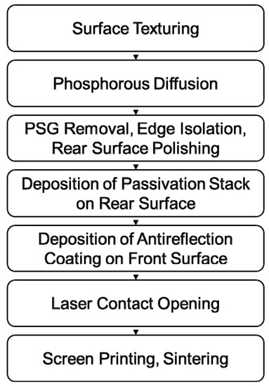 The as-cut monocrystalline silicon wafers were firstly textured with an alkali-based etching solution. Then, the samples were transferred into a tubular furnace to complete phosphorous diffusion and emitter formation. Subsequently, phosphosilicate glass (PSG) removal, edge isolation, and rear surface polishing were accomplished with a wet etching technique. After that, the aluminum oxide and silicon nitride were deposited by ALD (atomic layer deposition) and PECVD successively to form the passivation stack (Al2O3/SiNx) on the rear surface. Afterwards, the PECVD was still used to deposit the antireflection coating on the front surface. After the Al2O3/SiNx stack was locally opened by laser ablation, the electrode pastes (rear-side silver, rear-side aluminum, and front-side silver) were screen-printed and dried. Finally, the samples were sintered in a mesh belt furnace to complete the metallization and finish the solar cell manufacturing process.
