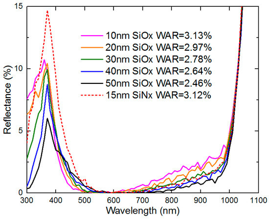 It can be found that along with the increase in the thickness of the SiOx third layer, the WAR decreased from 3.13% (10 nm SiOx) to 2.46% (50 nm SiOx). Apparently, the substitute of 15 nm SiNx with 10 nm SiOx as the third layer cannot improve the reflectance, which meant that the SiOx thickness should be at least 20 nm. On the other hand, in consideration of the fire-through silver contact metallization applied, the increase in thickness of the triple-layer antireflection coating was limited to guarantee efficient contact between silver and silicon. Therefore, three SiOx thicknesses were employed in the following experiments, at 20 nm, 30 nm, and 40 nm.