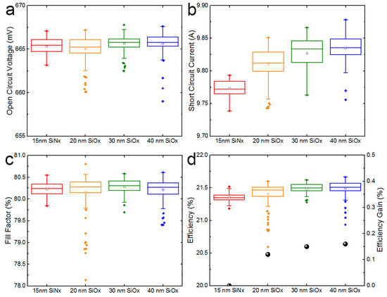 According to the simulation results, SiOx third layers with three different thicknesses were employed to construct the antireflection coating, i.e., 20 nm, 30 nm, and 40 nm, resulting in three groups of monocrystalline silicon PERC solar cells. A group with a 15 nm SiNx third layer served as a control. Each group contained about 100 samples, and the photovoltaic parameters are exhibited in box plots (Figure 4). It can be found that because of the presence of a few outliers, some mean values were significantly lower the median values. Therefore, the median values were extracted and listed in Table 2, which could better reflect the practical situation. In addition, the efficiency gains compared with the 15 nm SiNx group in Figure 4d were calculated with median values as well. It showed that the replacement of SiNx with SiOx as the third layer could effectively improve the short-circuit current (Isc). When the 20 nm SiOx third layer could bring about a current gain of 40 mA, another gain above 20 mA could be achieved by increasing the SiOx thickness to 30 nm or 40 nm. This current improvement was in accordance with the simulation results, which showed that the reflectance declined in short wavelengths. Except for the current, the other two photovoltaic parameters, i.e., open circuit voltage (Voc) and fill factor (FF), had little variation, which implied that the replacement of SiNx with SiOx as the third layer made no difference in the front surface passivation and front grid metallization. As a result, the photovoltaic conversion efficiency (Eff) was improved, owing to the improvement of short-circuit current. Because of the very similar currents, the 30 nm and 40 nm SiOx groups had very similar efficiencies, which were about 0.15% (abs.) higher than the SiNx group. In addition, from the box plots shown in Figure 4, it can be found that this replacement of SiNx with SiOx as the third layer had a negative impact on the current distribution to a certain extent, which resulted in a slight widening of the efficiency distribution. As mentioned above, the PECVD device adopted was designed for industrial production, and 240 samples were simultaneously fabricated in a tube furnace. Although we adjusted and optimized the deposition conditions to improve the consistency, such as gas flows (SiH4 and N2O), pressure, radio-frequency power, and temperatures of different zones, the conditions still needed to be fine-tuned to further reduce the distribution width and the number of outliers.