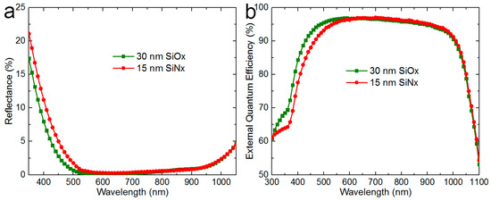In order to investigate the origin of current improvement, the reflectance and external quantum efficiency (EQE) were measured. It should be noted that because industrial production equipment was adopted to deposit the antireflection coating, the group differences between thicknesses where SiOx was the third layer might be covered up by the normal fluctuation. Therefore, only one group of the SiOx third layers was chosen to compare with the SiNx group. In consideration of the efficiency gain and economy, a 30 nm SiOx third layer was the optimal choice because it had a very similar efficiency gains and consumed less raw materials, compared with the 40 nm SiOx one. The reflectance curves of one 30 nm SiOx sample and one 15 nm SiNx sample before metallization are shown in Figure 5a, and the EQE curves after metallization are exhibited in Figure 5b. Because of the limitation of corresponding test instruments, there was a slight difference between two wavelength ranges in Figure 5, i.e., 350–1050 nm for reflectance and 300–1100 nm for EQE. The reflectance curves were smoothed to make the results easier to observe. It can be found that compared with the 15 nm SiNx sample, the 30 nm SiOx sample possessed a significantly lower reflectance below about 550 nm and almost the same reflectance above about 600 nm, which was in accordance with the simulation results. After metallization, the 30 nm SiOx sample possessed a significantly higher EQE below about 550 nm and almost the same EQE above about 600 nm, which complied well with the reflectance results. On account of the EQE improvement, the 30 nm SiOx sample exhibited a higher short-circuit current, which verified the above photovoltaic parameters.