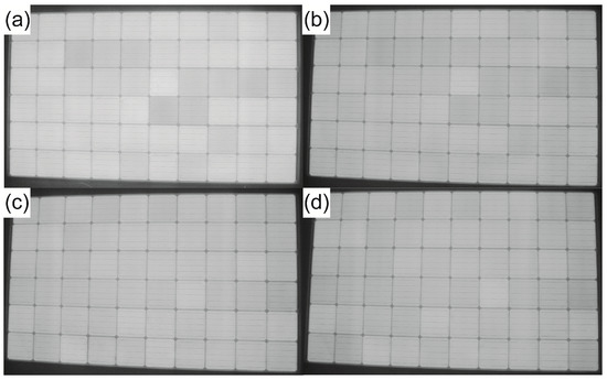 Electroluminescence images of monocrystalline silicon PERC solar modules with 30 nm SiOx as the third layer of antireflection coating before and after the LID test (a,b) or PID test (c,d).