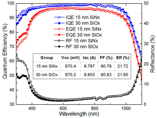 Reflectance (RF), external quantum efficiency (EQE), and internal quantum efficiency (IQE) curves of monocrystalline silicon PERC solar cells with the 15 nm SiNx third layer and the 30 nm SiOx third layer as the antireflection coating. The mean photovoltaic parameters of each group containing about 400 solar cells are listed.