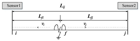 For Figure 3, vi = vj = c = 0.3 m/ns is the propagation velocity of the EM wave, and the fault distance from the PD position to sensor 1 is given by