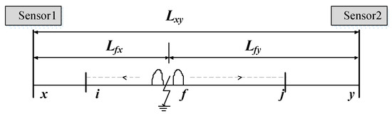 where Lfi and Lfj are the distance from the PD position to I and to j, ti and tj are the time when sensor I and sensor j detect the signals. Equation (5) is a conventional PD location method, and the PD signals can propagate to other sensors through I and j. In view of the integrity of GIS, the propagation velocity of EM wave can be considered as remaining constant. This method lays a foundation for accurate PD locating using multiple sensors in GIS. Figure 3 can be expanded to Figure 4 below, and the EM waves travel through I and j to adjacent sensor x and y. Replacing I and j with x and y in Equations (5) and (6), the distance of extended TDOA can be expressed as