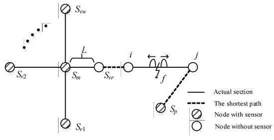 The number of branches included in the shortest path of node i to node j is defined as the shortest path length Pij. Under the condition of installing sensors at the terminal node (subject to xt = 1), a suitable nonterminal node should be selected to install a sensor so that the EM wave passes through, at most, one nonterminal node before reaching the sensors. Therefore, the maximum number of nonconfigurable nodes between any adjacent configurable nodes is 1, and Pij should be no more than 2 (subject to Pij = 2). An optimization model can be obtained: