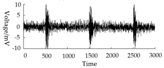 The improved DTCWT method is used to denoise the measured partial discharge signal. The sampling number of UHF signal is 3000. The decomposition level of DTCWT is 5. The signal components of DTCWT, of which the TE values are in the top three, are reconstructed. The noise reduction result is shown in Figure 10.