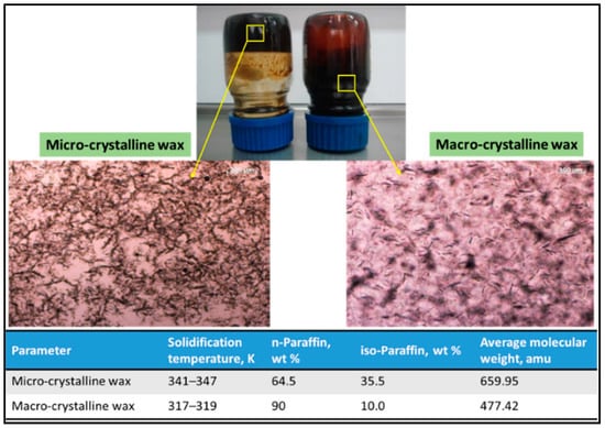 The wax in petroleum crudes exists in various phase states (gas, liquid, or solid) depending on pressure and temperature [32]. It consists of paraffin hydrocarbons (known as paraffin wax) and naphthenic hydrocarbons (known as iso-paraffin wax) (Table 1). Paraffin wax has a density of ~900 kg/m3 and its a heat capacity is of ~2.14–2.9 J·g−1·K−1, and it is also recognized as a macro-crystalline waxes [33]. On the other hand, iso-paraffin wax, which is produced during the crude oil refinery process, is identified as a micro-crystalline wax. Iso-paraffin wax has better engine-combustion characteristics due to its high melting point and molecular weight [34]. The crystal structure of micro-crystalline waxes is smaller and thinner than that of macro-crystalline waxes, making them more flexible. Macro- and micro-crystalline waxes have different functional properties (including viscosity and melting point) due to the differences in their hydrocarbon content (linear or branched). Oliveira et al. [35] investigated the influence of micro- and macro-crystalline paraffin on the properties of crude oil and found that Mic-wax can be dissolved or dispersed in solvents and display a sharp transition of gel-strength. The micro-crystalline wax usually crystallizes at a higher temperature compare to macro-components where stronger gels are formed. This phenomenon might be due to the fact that micro-components possess lower number of carbons compare to macro-components (Figure 1).