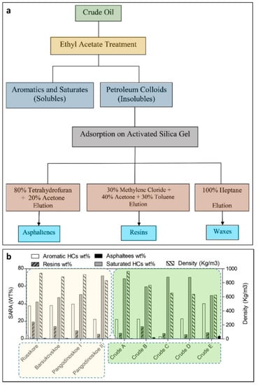 - Aske, N.; Kallevik, H.; Sjöblom, J. Determination of saturate, aromatic, resin, and asphaltenic (SARA) components in crude oils by means of infrared and near-infrared spectroscopy. Energy Fuels 2001, 15, 1304–1312. [Google Scholar] [CrossRef]