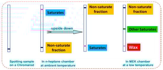 The use of ultrasound and laser spectroscope has proven to be successful in determining the presence of small solid particles and paraffin within paraffin-containing oil samples [120]. However, these approaches were only performed on a laboratory scale. The investigation and production strategies in deep sea zones is economically feasible for deep water drilling. Development of oil well industry (~160 miles away from the shore) explores more extensive wax problems due to the enlarged transportation lines on cold ocean level. Practical methods still need to be designed for application of these techniques to existent subsea pipelines. Thin-layer chromatography with flame ionization detection (TLC-FID) has been utilized to describe and detect petroleum-associated resources (such as bitumen and crude oils) [121]. Lu et al. [122] presented a simple technique for detecting wax content in petroleum products. The method depends on TLC-FID and comprises a two-step development with n-heptane and methyl ethyl ketone (MEK) as solvents. Saturates are separated from other components (more polar) based on their high solubility in n-heptane and low interaction with silica (adsorbent). Then waxes are separated from the saturate portion using MEK at a low temperature, where waxes are present in solid state (Figure 3).