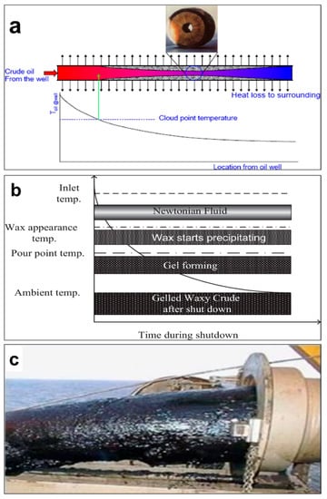 The temperature at which paraffin crystal formation begins is the wax appearance temperature (WAT). The WAT of various origin crude oils was in the range of 14.2–37.8 °C depending on the wax content and API gravity (Table 2). Moreover, the crude oils have wide range of physical property of precipitation (−3.42 to 6.39 mW) and melting energy (–2.5 to 7.46 mW) [127]. However, wax formation and deposition on the pipelines wall begin below the WAT [128,129,130]. The variance between the cold temperature at sub-sea level and the warmer temperature of the internal pipeline fluid is the main cause of wax formation [96]. WAT is considered as the freezing point where the fluids begins to solidify [131], which causes a decrease in pipeline flow as precipitated wax becomes heavier and thicker. Exposure of pipelines to cold surroundings causes accumulation, gathering, and solidification of droplets, giving a cloudy appearance [127]. Therefore, the flow oil ultimately reduce, causing blockage and high pressure in pipelines. At an ocean floor temperature (4 °C), wax molecules start to deposit on the pipeline walls. However, the heat loss is inconsistent, as there is a difference in temperature gradient within the pipeline, which affects the wax deposition rate [20]. In waxy crude oil, precipitation, deposition, and gelation are primarily responsible for wax deposition. Clogging, due to continuous deposition of waxes, ultimately results in an abrupt shut down of pipelines (Figure 4a).